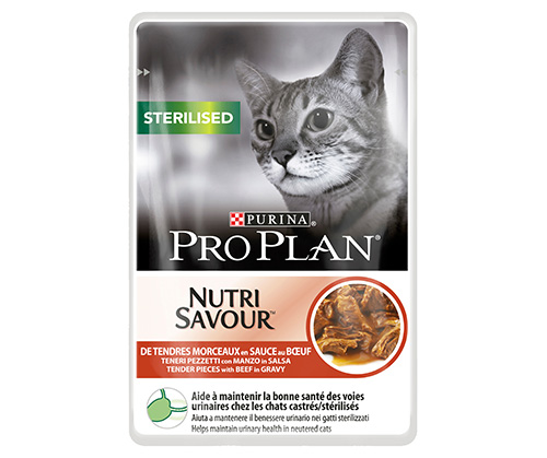 Pro Plan Sterilised nutrisavour to pełnoporcjowa karma dla dorosłych kotów po sterylizacji, z wołowiną w sosie.Charakterystyka karmy Pro Plan Sterilised z wołowiną