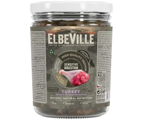 Mięso z indyka 42,69%, zredukowany bulion z nóżek wieprzowych 37,03%, bulion z indyka 18,2%, naturalny zagęszczacz 0,91%, mięta pieprzowa 0,39%, rumianek pospolity 0,39%, szpinak 0,39%.Analiza składu karmy Elbeville