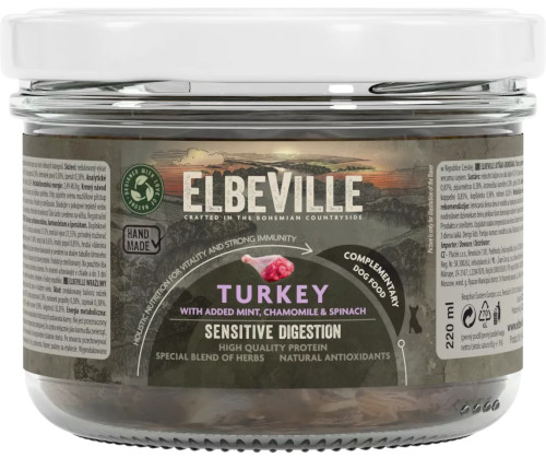 Mięso z indyka 42,69%, zredukowany bulion z nóżek wieprzowych 37,03%, bulion z indyka 18,2%, naturalny zagęszczacz 0,91%, mięta pieprzowa 0,39%, rumianek pospolity 0,39%, szpinak 0,39%.Analiza składu karmy Elbeville