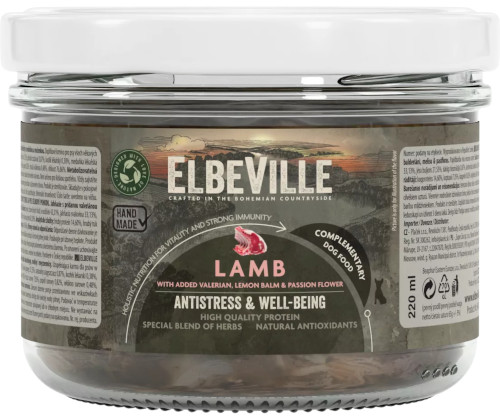 Mięso z jagnięciny 42,69%, bulion z wieprzowych skórek i nóżek 37,03%, bulion jagnięcy 18,2%, naturalny zagęszczacz 0,91%, kozłek lekarski 0,39%, melisa lekarska 0,39%, męczennica cielista 0,39%.Analiza składu karmy Elbeville