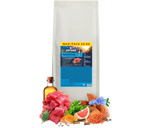 Świeży tuńczyk 26%, Dehydratyzowane białko tuńczyka 25%, Bataty 11%, Czerwona soczewica 9%, Skrobia ziemniaczana 8%, Tłuszcz drobiowy (konserwowany naturalnymi tokoferolami) 7,5%, Suszona pulpa buraczana 3%, Naturalny aromat roślinny 2,5%, Drożdże, Suszony korzeń cykorii 2%, Siemię lniane 1%, Minerały, Olej z łososia 0,5%, Ekstrakt z juki Schidigera 0,5%, Chlorek choliny 0,2%, Mieszanka suszonych ziół i ekstraktów roślinnych 0,15% (0,1% suszonego tymianku, Rozmaryn i pietruszka, 0,05% Ontario VitalAge Blend™ (ekstrakty roślinne z grejpfruta, kurkumy, goździków i rozmarynu)), mannanooligosacharydy (Active MOS 0,1%), siarczan chondroityny (270 mg/kg), siarczan glukozaminy (200 mg/kg), Lacticaseibacillus paracasei HA - 108 inaktywowany (7,5 x 10^9 komórek/kg).Analiza składu karmy Ontario Puppy & Junior