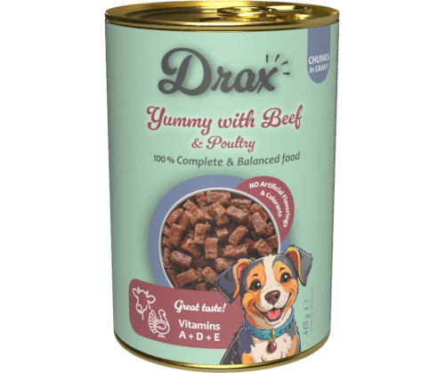 Kompletna karma dla dorosłego psa. Smaczne kawałki wołowiny i drobiu w delikatnym sosie idealnie nadają się do codziennego karmienia i łasucha.Zalety karmy Drax dla psów: