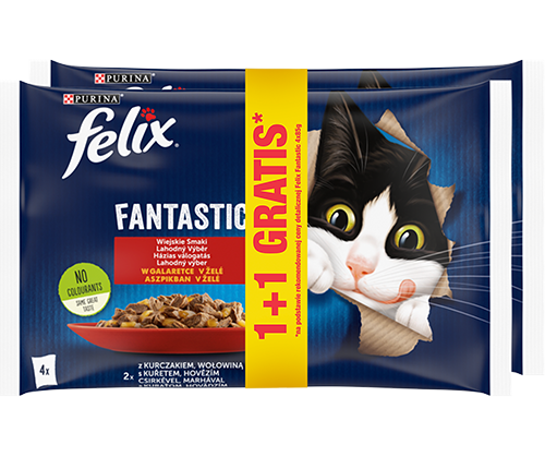 FELIX® to gama pysznych posiłków, które spełnią wysokie wymagania sprytnych kotów. Dania te wyglądają, pachną i smakują tak wyśmienicie jak jedzenie, które mógłbyś przygotować sam! Każda receptura, opracowana z wysokiej jakości składników zawiera delikatne kąski w soczystych galaretkach lub aromatycznych sosach, które Twój kot pokocha! Posiłki są też źródłem kwasów tłuszczowych Omega-6 i zawierają odpowiedni zestaw witamin, aby Twój kot był pełen energii i gotowy do psot! Pełne wartości odżywczych, w 100% spełniają dzienne potrzeby Twojego kota, jeżeli są podawane zgodnie z zaleceniami na opakowaniu. A to nie wszystko! FELIX® to produkty dostępne w szerokiej gamie smaków, aby każdego dnia zaspokajać uwielbienie Twojego kota dla różnorodności. Naprawdę smakuje tak dobrze jak wygląda!